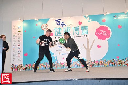 首屆香港先生Rocky鄭健樂擔任今屆健康博覽大使,他更邀請相識30年老友星級健身教練杜德智Orlando一齊做連串運動, 兩人又打拳兼做掌上壓加跳繩,及後再加上22歲東京奧運香港賽艇選手洪詠甄一起示範健身操,分享健身教練及運動員健康飲食心得。