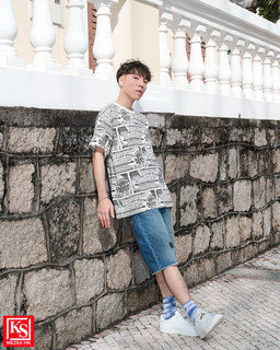 貝兒另一造型則利用了同色系漸層穿搭技巧,以超寬鬆低彩度T恤配搭貼身Levi’s® 501® 高腰牛仔短褲,添加同色系淺藍牛仔漁夫帽或再加上藍色牛仔恤衫,柔和順眼又耐看,營造休閒慵懶又平易近人的文青造型。而Eugene 穿上Levi’s®寬鬆復古版型黑白印花TEE,獨特印花輕輕提升日常造型的時尚感,簡單配搭Levi’s® 405標準版型短褲,巧妙配搭同色系紮染小襪,低調得來又俏皮,塑造快活時尚造型。