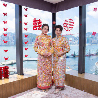 今早在酒店進行接新娘及斟茶給長輩儀式,「逆齡外母」珊姐與女兒一起穿上裙褂,